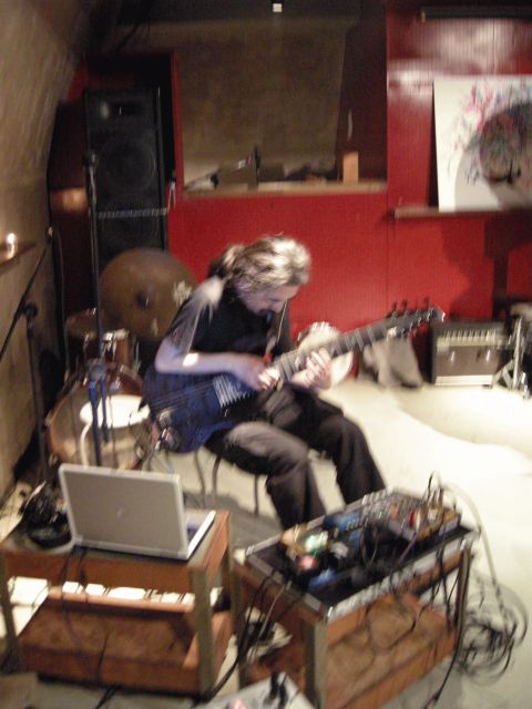 出力される、還ってくる信号に対して反応をするギター奏者。
